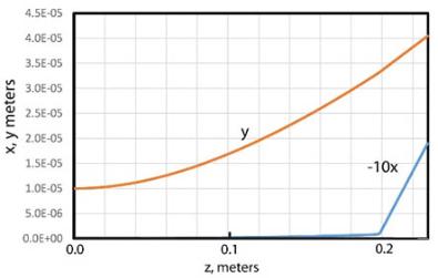 Starting at z=0, x=0, and y=10 microns the simulated electron trajectory