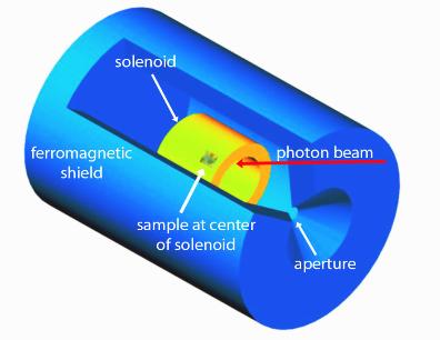 surrounded by a ferromagnetic shield with an aperture on the axis.